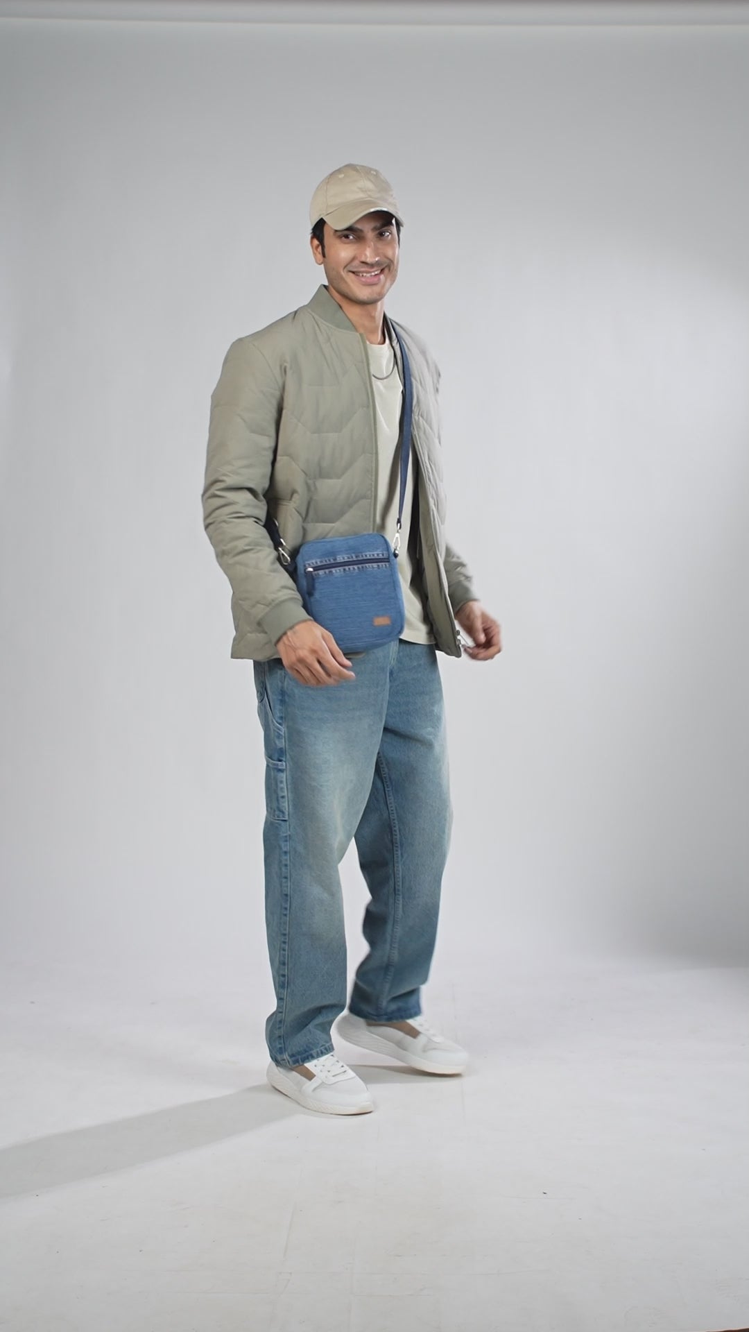 This sling is designed in an elegant manner using a single shade of post consumer jeans by integrating the seams. This hands-free sling can be used during a daily walk, travel, etc. It has three card holders in the main compartment and has two open pockets in the front and back.